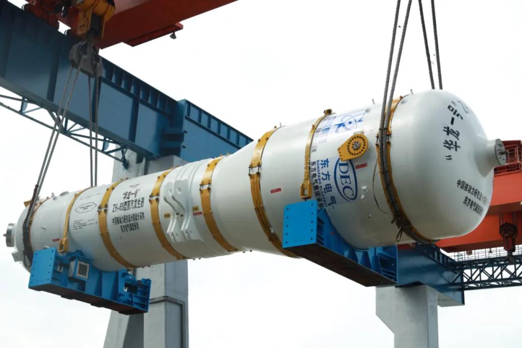 2017年10月17日,由集团公司承制的全球首堆“华龙一号”蒸汽发生器在东方重机顺利完工发运。该设备重达390吨,高22米,功率1150兆瓦,标志并见证着中国第三代核电设备自主设计制造能力的成熟。
